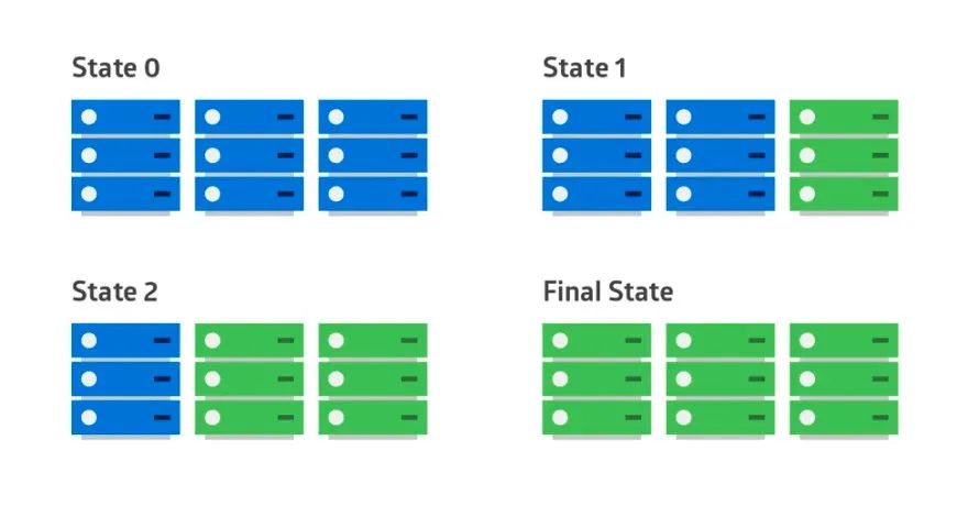 下图显示了该部署模式:旧版本显示为蓝色,新版本显示为绿色,它们部署在集群中的每一台服务器上。
