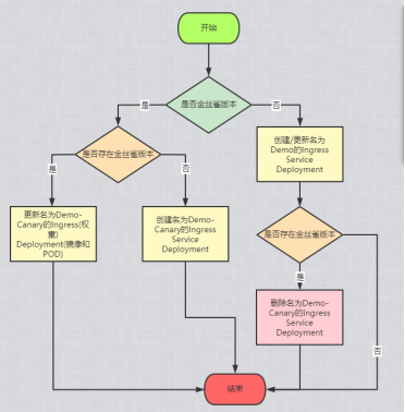 -canary后缀的ingress、service、deployment,如果有则替换金丝雀版本的镜像,如果没有则创建-canary后缀的ingress、service、deployment。 - 如果发布正常版本,则先检测是否有
