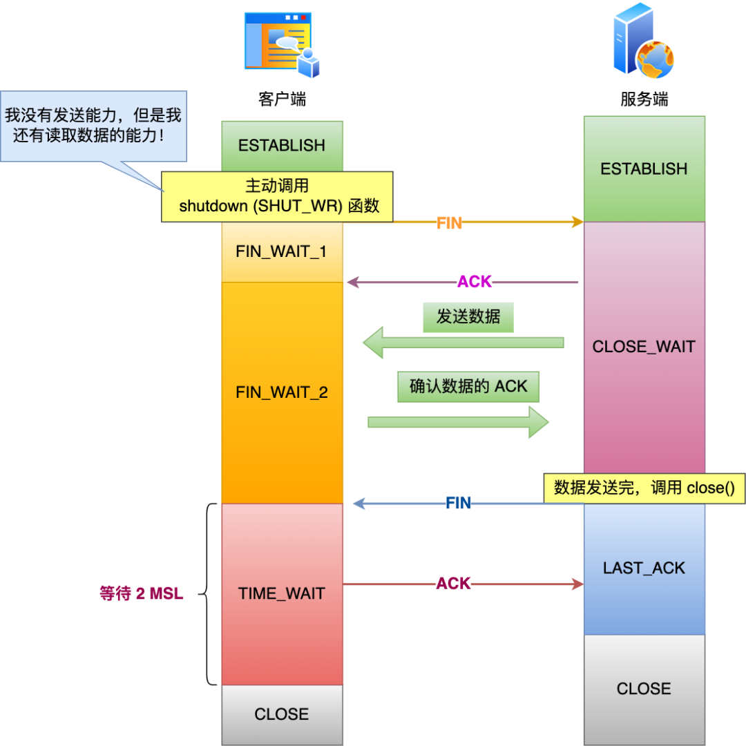 如果服务端应用程序有数据要发送的话,就发完数据后,才调用关闭连接的函数;