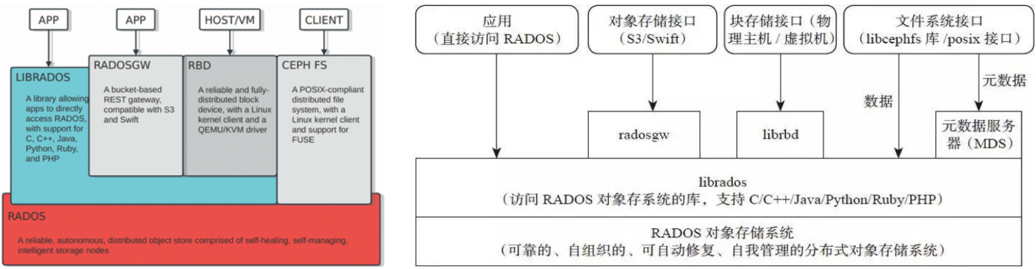 - 应用层:基于高层接口或者基础库librados开发出来的各种APP,或者主机、VM等诸多客户端