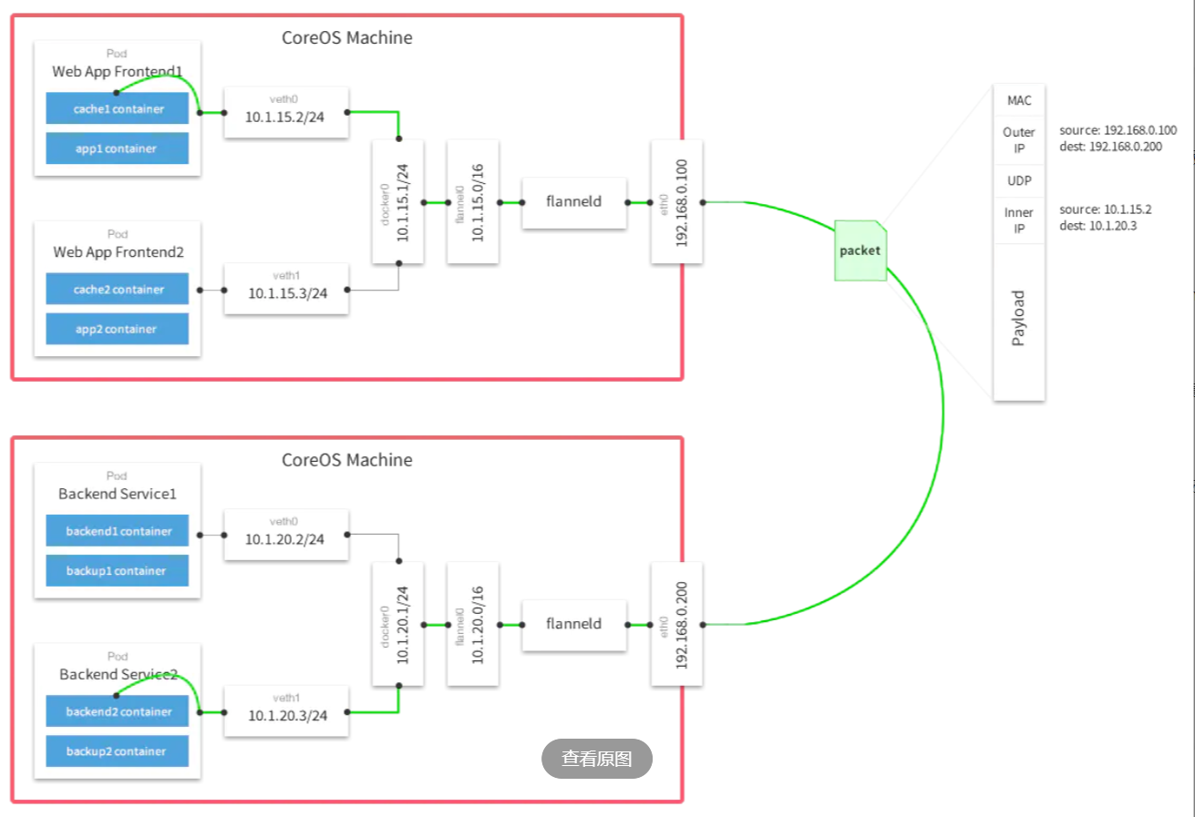 1、数据从源容器中发出后,经由所在主机的docker0虚拟网卡转发到flannel0虚拟网卡,这是个P2P的虚拟网卡,flanneld服务监听在网卡的另外一端。