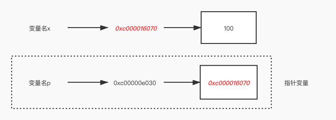 fmt.Println(p) // p的值为变量x的地址:0xc000016070