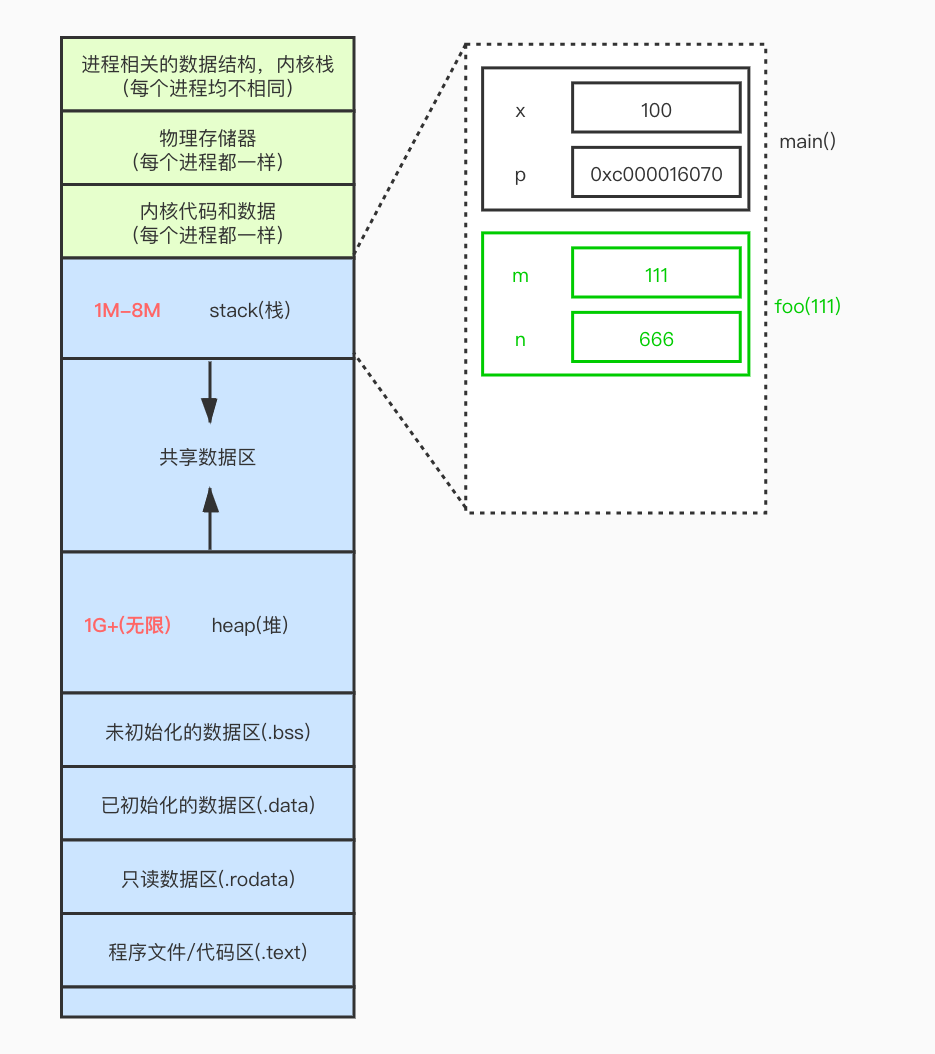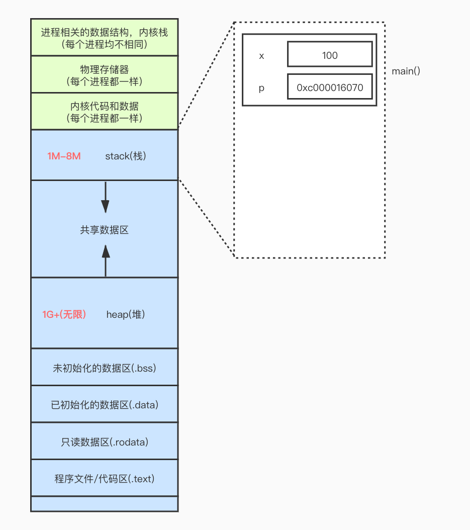 上述代码都存储在用户区的stack(栈)区. 一般go程序调用 make() 或者 new()出来的都存储在用户区的heap(堆)区