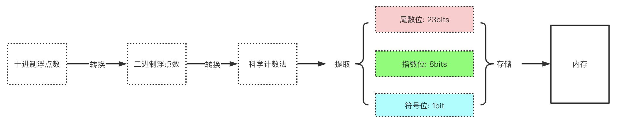 十进制浮点数若想保存到计算机内存中,必须首先转换成二进制浮点数,而为了区分精度,按照IEEE标准需要从二进制浮点数中提取三个部分:尾数位、指数位、符号位,这三部分才是计算机内存真正存储的二进制。