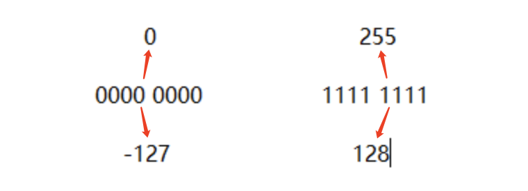 因此现在也需要二进制0000 0000~ 1111 1111与-127~128一一对应(注意:此处的二进制数只是与-127~128区间的数字有对应关系),如下图: