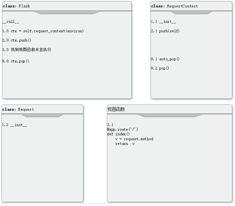 之前我们已经论述过了,每次请求过来都会触发app(),所以会触发FLask类的__call__方法,__call__方法会触发Flask类的wsgi_app()方法。然后所有的请求的整个生命周期都在整个wsgi_app()里面了。