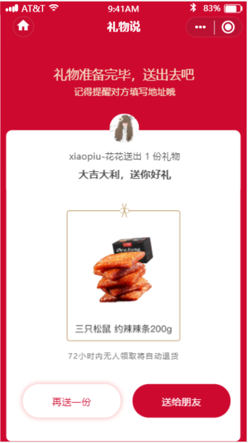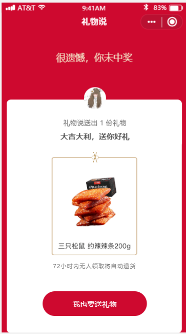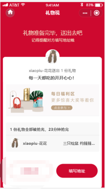 当开奖的时候通过模板消息提醒用户,当用户点击来后到结果页,当你的好友收下礼物后,你可以提醒他填写收货地址,即可收到礼物了,如果未中奖也要提醒用户
