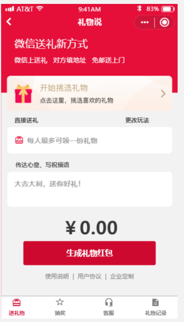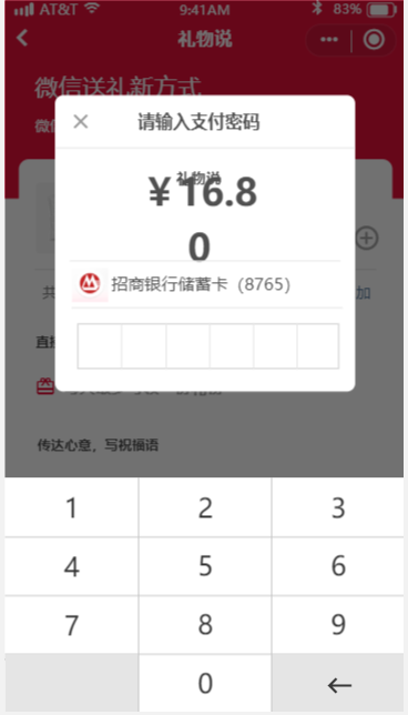 付款后的礼物就可以生成礼物红包的方式分享给微信好友,同时还可以在上面填写你的祝福和寄语。