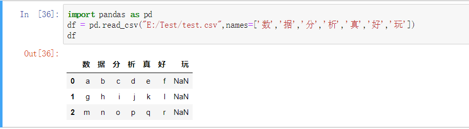df = pd.read_csv("E:/Test/test.csv",names=['数','据','分','析','真','好','玩'])