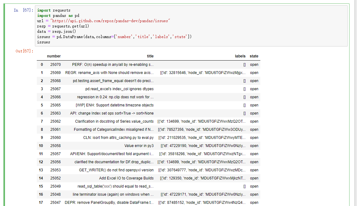 issues = pd.DataFrame(data,columns=['number','title','labels','state'])