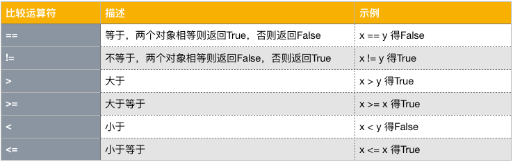 比较运算用来对两个值进行比较,返回的是布尔值True或False,我们以x=9,y=2为例来依次介绍它们