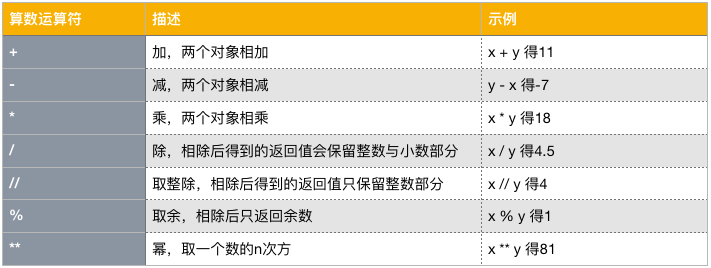 python支持的算数运算符与数学上计算的符号使用是一致的,我们以x=9,y=2为例来依次介绍它们