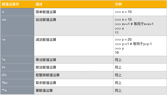 python语法中除了有=号这种简单的赋值运算外,还支持增量赋值、链式赋值、交叉赋值、解压赋值,这些赋值运算符存在的意义都是为了让我们的代码看起来更加精简。我们以x=9,y=2为例先来介绍一下增量赋值