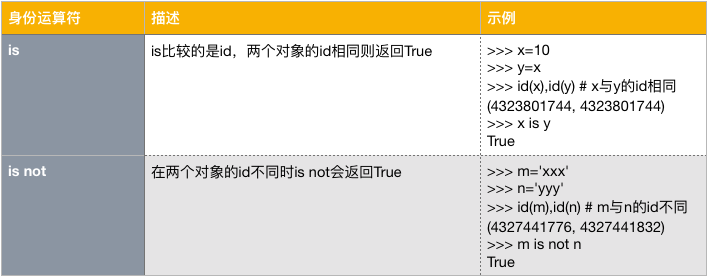 >>> x is y # is比较的是id,x与y的值相等但id可以不同