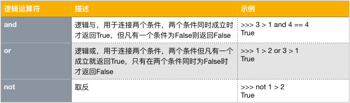 逻辑运算符用于连接多个条件,进行关联判断,会返回布尔值True或False