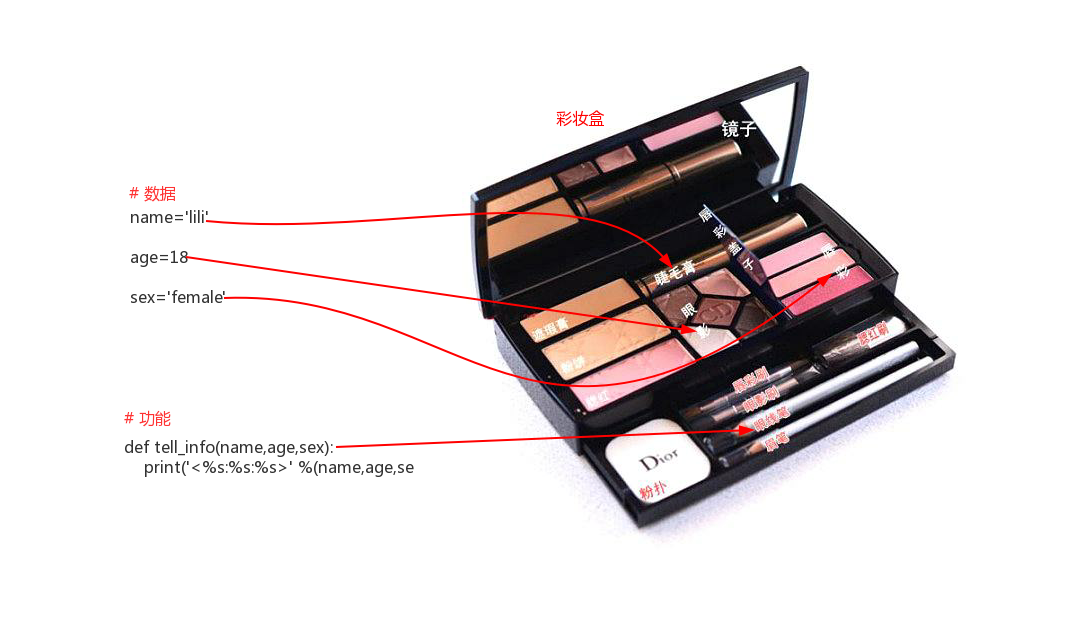 如果把”数据“比喻为”睫毛膏“、”眼影“、”唇彩“等化妆所需要的原材料;把”功能“比喻为眼线笔、眉笔等化妆所需要的工具,那么”对象“就是一个彩妆盒,彩妆盒可以把”原材料“与”工具“都装到一起