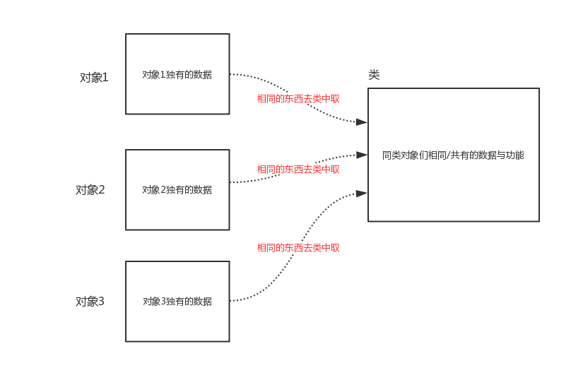 至此,我们造出了三个对象与一个类,对象存放各自独有的数据,类中存放对象们共有的内容