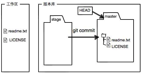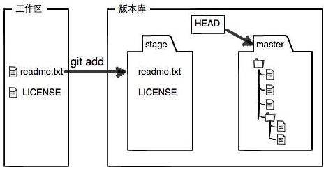 Git的版本库里存了很多东西,其中最重要的就是称为stage(或者叫index)的暂存区,还有Git为我们自动创建的第一个分支master,以及指向master的一个指针叫HEAD,HEAD指针指向的就是当前在用的版本