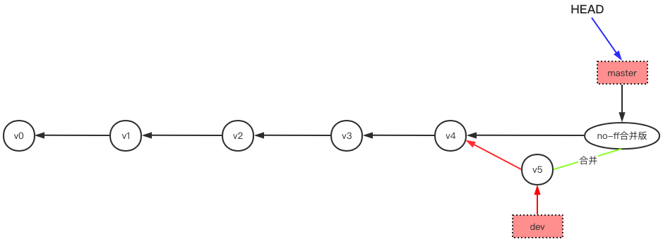 $ git merge --no-ff -m "no-ff合并版" dev # --no-ff参数,表示禁用Fast forward;因为本次合并要创建一个新的commit,所以加上-m参数,把commit描述写进去。