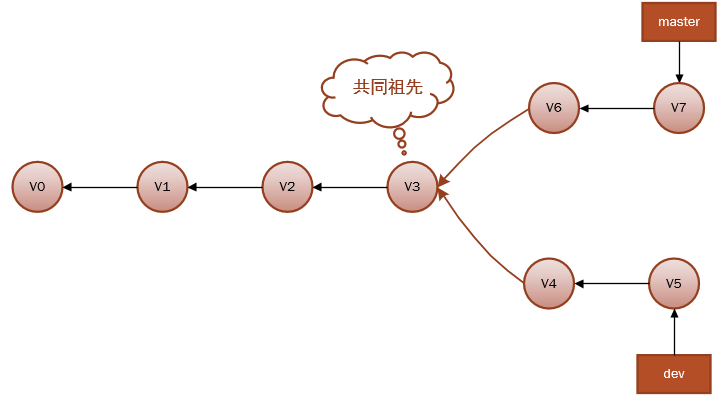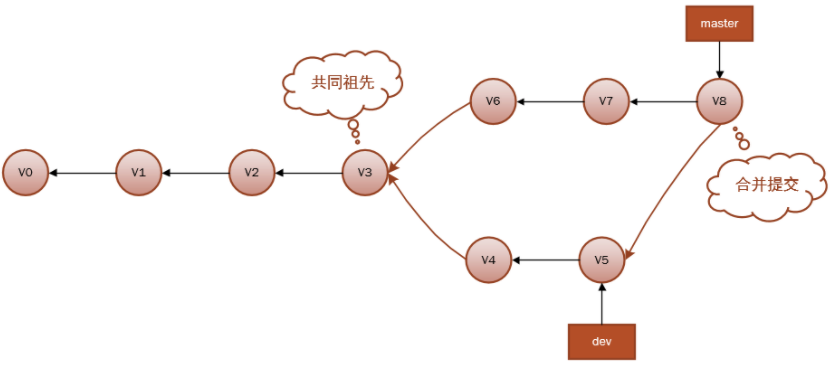 分支和dev分支不在一条线上,即v7不是v5的直接祖先,Git 不得不进行一些额外处理。就此例而言,Git 会用两个分支的末端(v7 和 v5)以及它们的共同祖先(v3)进行一次简单的三方合并计算。合并之后会生成一个和并提交v8: