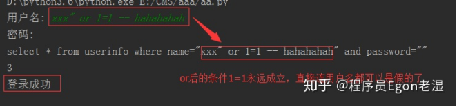 根本原理:就根据程序的字符串拼接name=‘%s’,我们输入一个*xxx’ – haha\***,用我们输入的xxx加’在程序中拼接成一个判断条件name=’*xxx’ – haha*****’