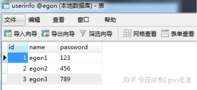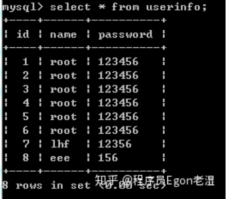 ((6, 'root', '123456'), (7, 'lhf', '12356'), (8, 'eee', '156'))
