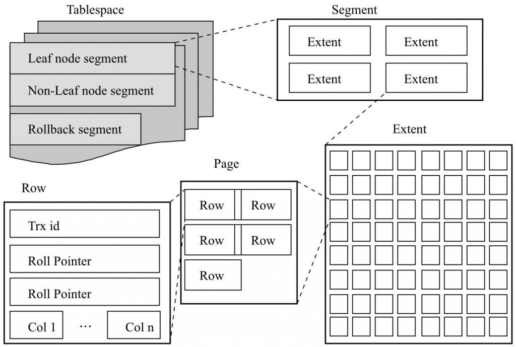 InnoDB存储引擎的逻辑存储结构和 Oracle大致相同 ,所有数据都被逻辑地存放在一个空间中 ,我们称之为表空间 ( tablespace ) ,表空间又由:段 ( segment ) 、区 ( extent ) 、页 ( page ) 组成 。页在一些文档中有时也称为块(block)或磁盘块,一次io操作的是一个磁盘的数据,即一页数据。