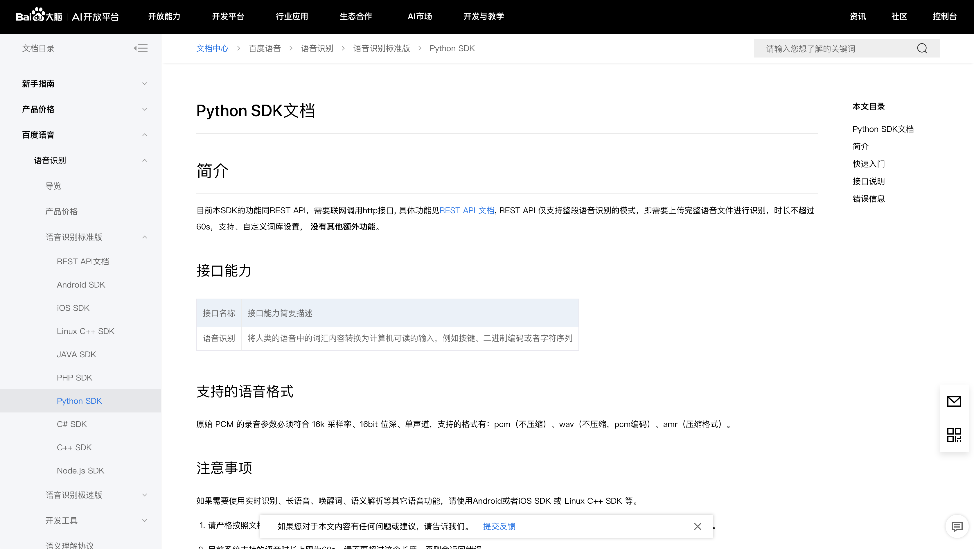 首先第一步,我们需要知道百度的语音识别功能怎么使用,对视频文件有什么需求。以下就是百度python SDK的文档页面: