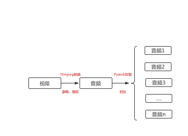 在音频提取过程中还要对音频的采样率、声道数、码率进行设置,同时指定输出音频格式。除此之外,由于百度API最多只支持60秒长度的音频,而我们需要转换的视频长度通常要远高于这个时长,所以还需要使用pydub对音频文件进行切割,然后分段进行文字转换。所以从视频到音频的大概流程应该是这样的: