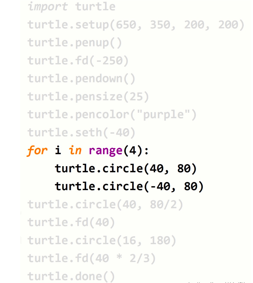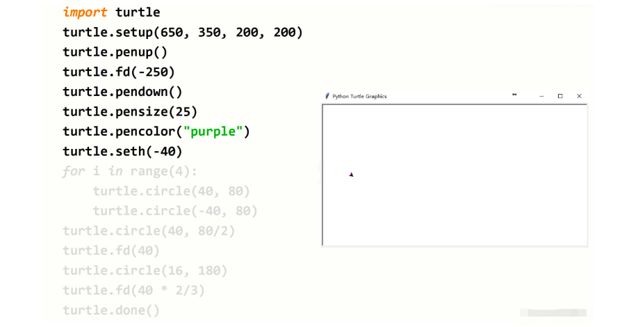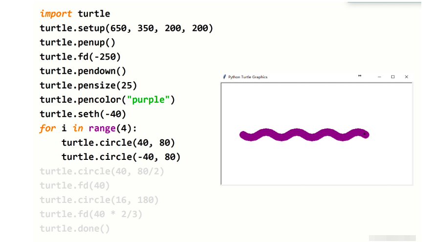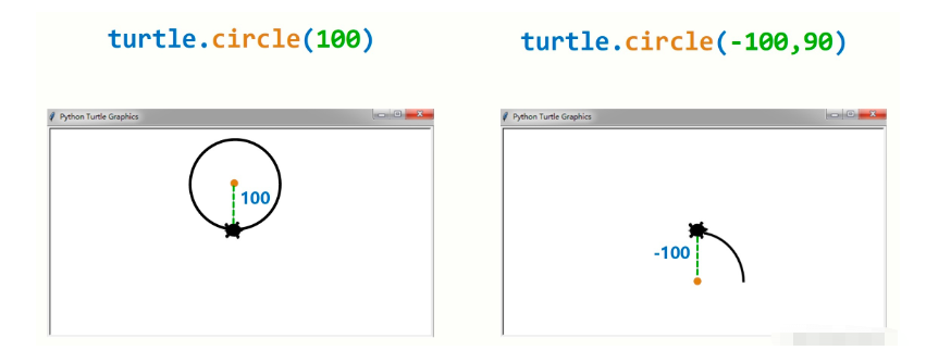 turtle.circle(r, extent=None):根据半径r绘制extent角度的弧形- r: 默认圆心在海龟左侧r距离的位置