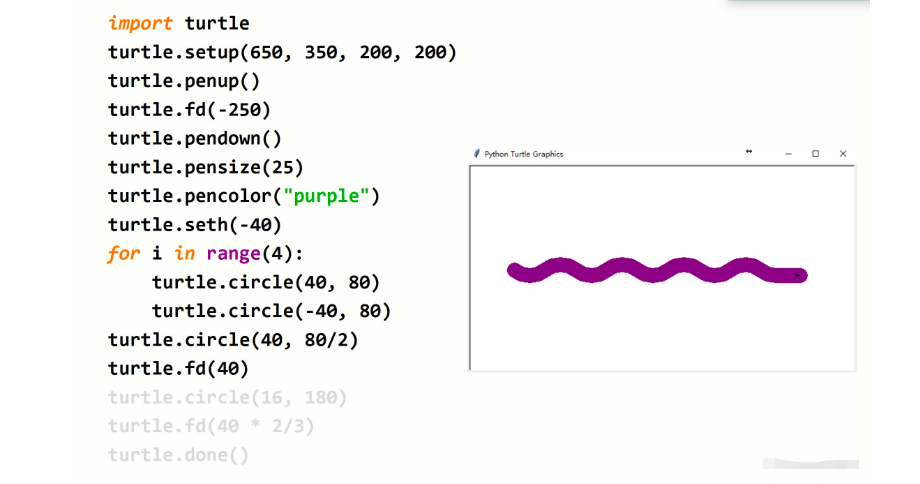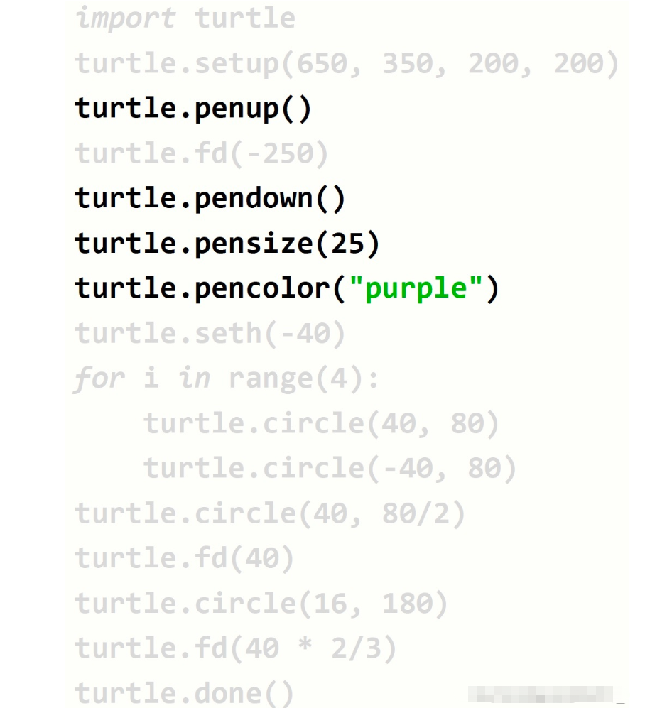 turtle.pendown()别名turtle.pd():落下画笔,海龟在爬行 -
