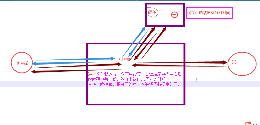 简单概括就是将对数据库操作查询所得到的数据放入另外一台机器上(缓存)中,当用户再次请求时,直接去缓存中拿,避免对数据库的频繁操作,加快数据的显示时间,需要知道的是,缓存里面的数据一般都设置有超时时间,缓存一般用在数据变化不大,实时率不高的情况下。