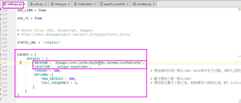 'MAX_ENTRIES': 300, # 最大缓存个数(默认300)