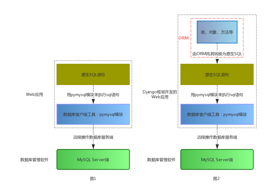 为了解决上述问题,django引入了ORM的概念,ORM全称Object Relational Mapping,即对象关系映射,是在pymysq之上又进行了一层封装,对于数据的操作,我们无需再去编写原生sql,取代代之的是基于面向对象的思想去编写类、对象、调用相应的方法等,ORM会将其转换/映射成原生SQL然后交给pymysql执行,详见图2