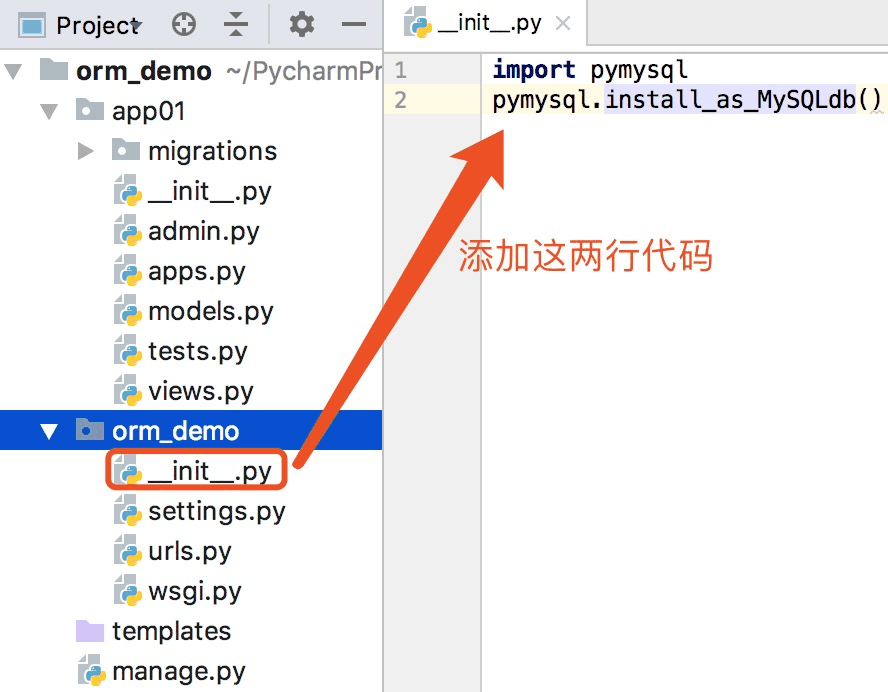 2.1.4 其实python解释器在运行django程序时,django的orm底层操作数据库的python模块默认是mysqldb而非pymysql,然而对于解释器而言,python2.x解释器支持的操作数据库的模块是mysqldb,而python3.x解释器支持的操作数据库的模块则是pymysql,,毫无疑问,目前我们的django程序都是运行于python3.x解释器下,于是我们需要修改django的orm默认操作数据库的模块为pymysql,具体做法如下