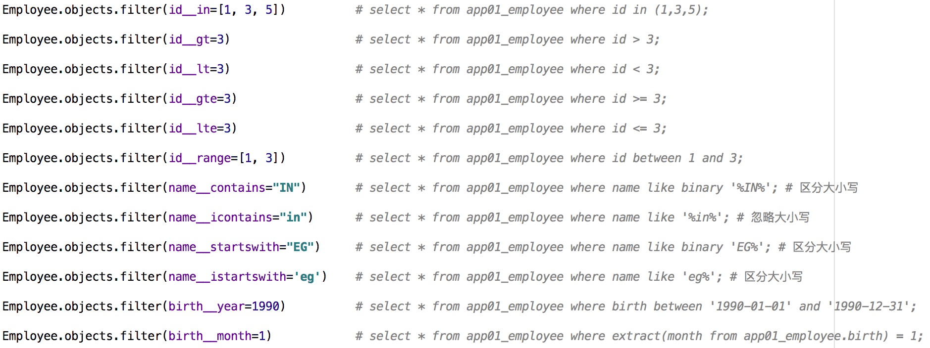 res3=Employee.objects.filter(id__gt=3).aggregate(Avg("salary")) # select avg(salary) as salary__avg from app01_employee where id > 3;