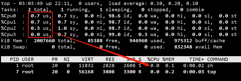 发现容器内进程消耗0.7+0.7+0.3+0.0,而容器内的sh进程与top进程都没有消耗这么多cpu,这就验证了我们的说法:在容器内是无法通过top命令获取容器对cpu的占用率的