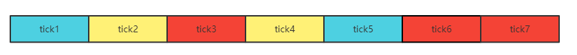 补充:一个cpu的完整工作时间,可能服务过多个进程,如下图颜色标注代表cpu服务过3个进程,红色框代表的进程可能占用的只是tick3、tick6、tick7这三个时间片,那么该段时间内,红色框进程对cpu的占用率(注意对cpu的占用率一定统计的是单颗)就是3/7