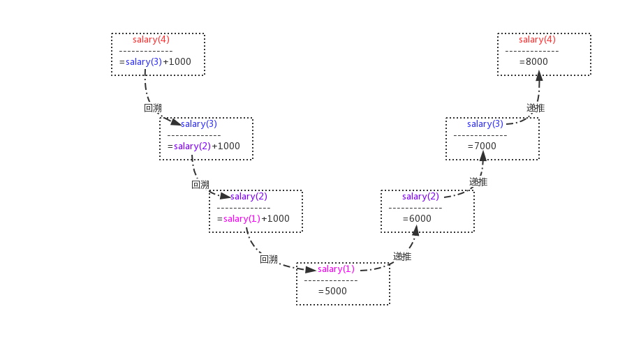 要知道第四个人的月薪,就必须知道第三个人的,第三个人的又取决于第二个人的,第二个人的又取决于第一个人的,而且每一个员工都比前一个多一千,数学表达式即: