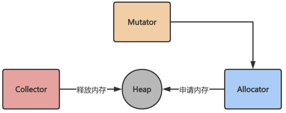 在程序的执行过程中,用户程序Mutator通过内存分配器Allocator在堆Heap上申请内存(也可能会改变对象的引用关系,或者创建新的引用),垃圾回收器Collector会定时清理堆上的内存。