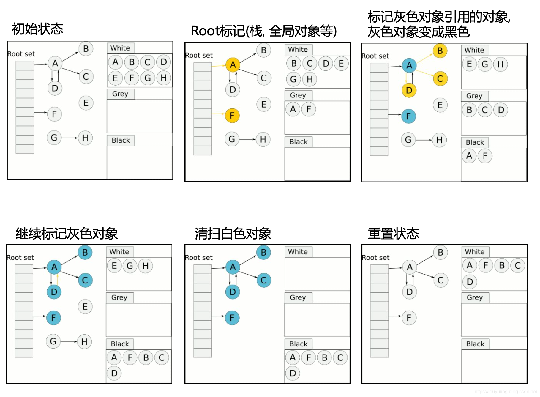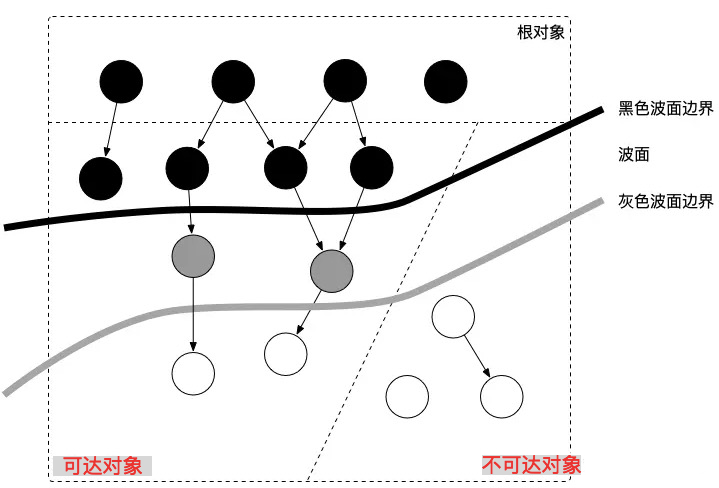 流程:在A对象引用B对象的时候,B对象被标记为灰色。