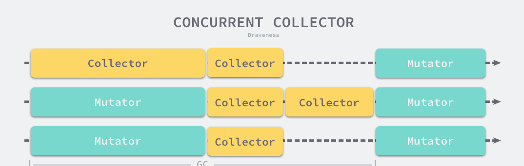 需要注意的是,增量式的垃圾收集需要与三色标记法一起使用,为了保证垃圾收集的正确性,我们需要在垃圾收集开始前打开写屏障,这样用户程序修改内存都会先经过写屏障的处理,保证了堆内存中对象关系的强三色不变性或者弱三色不变性。虽然增量式的垃圾收集能够减少最大的程序暂停时间,但是增量式收集也会增加一次 GC 循环的总时间,在垃圾收集期间,因为写屏障的影响用户程序也需要承担额外的计算开销,所以增量式的垃圾收集也不是只带来好处的,但是总体来说还是利大于弊。