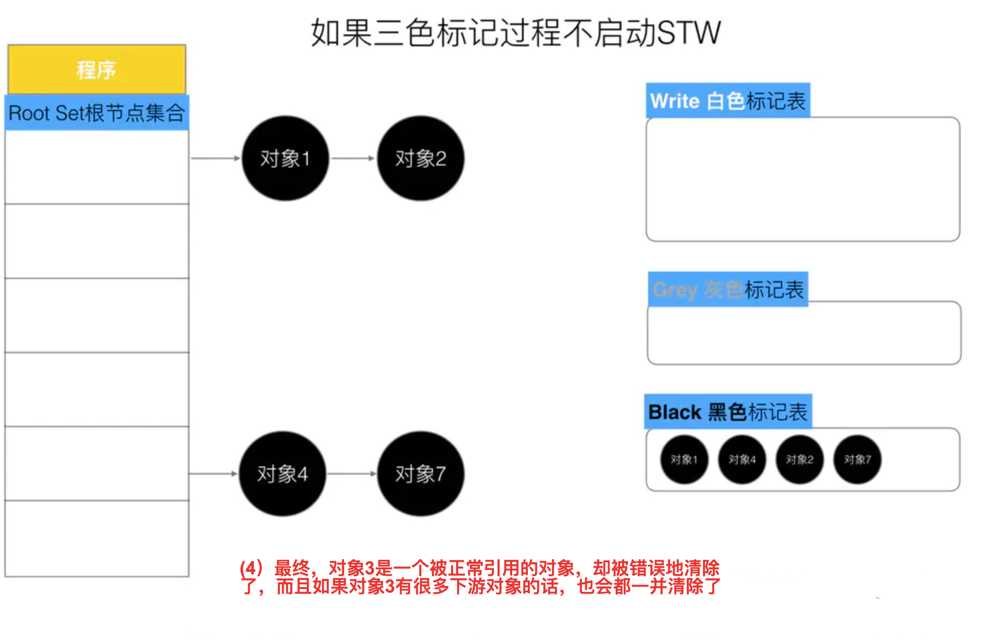 在完成三色标记后,可能用户程序在标记执行的过程中修改对象的指针,因为三色标记清除算法不支持并发和增量执行,所有需要STW。如果用户程序建立从A对象到D对象的引用,但程序中已经不存在灰色对象了,所有D对象会被垃圾收集器错误地回收。本来不应该被回收的对象被回收了,在内存管理中是非常严重的错误,这种错误称为悬挂指针,即指针没有指向特定类型的合法对象,影响内存安全性,想要并发或者增量地标记对象需要使用屏障技术。