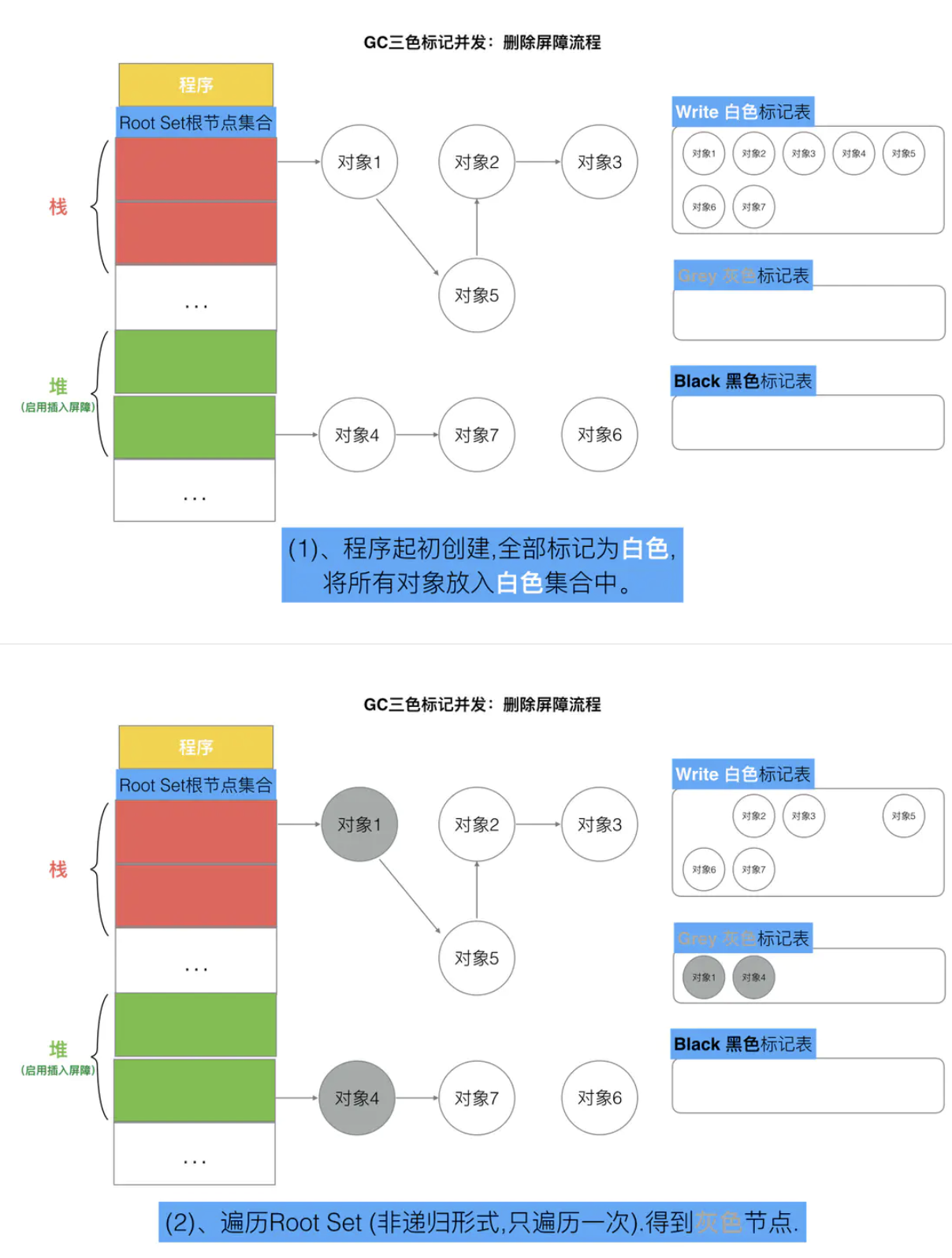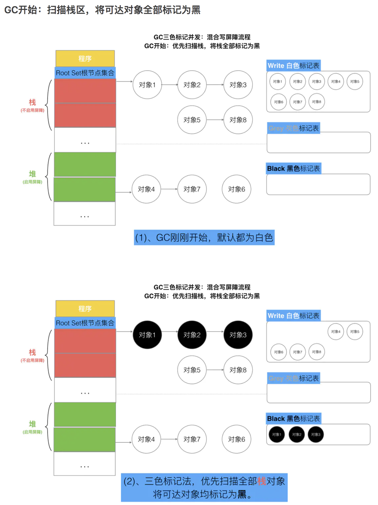 1、GC开始将栈上的对象全部扫描并标记为黑色(之后不再进行第二次重复扫描,无需STW),