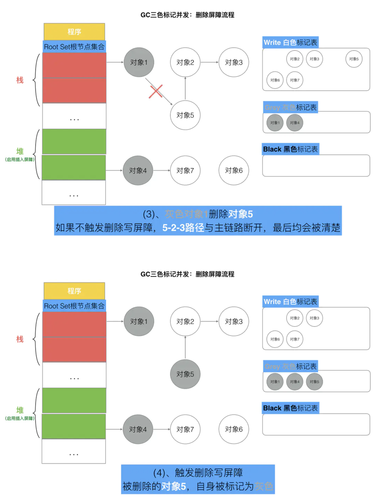 删除写屏障的缺点与插入写屏障一样:同样存在回收精度较低的问题:一个对象即使被删除了最后一个指向它的指针也依旧可以活过这一轮,在下一轮GC中被清理掉,如下