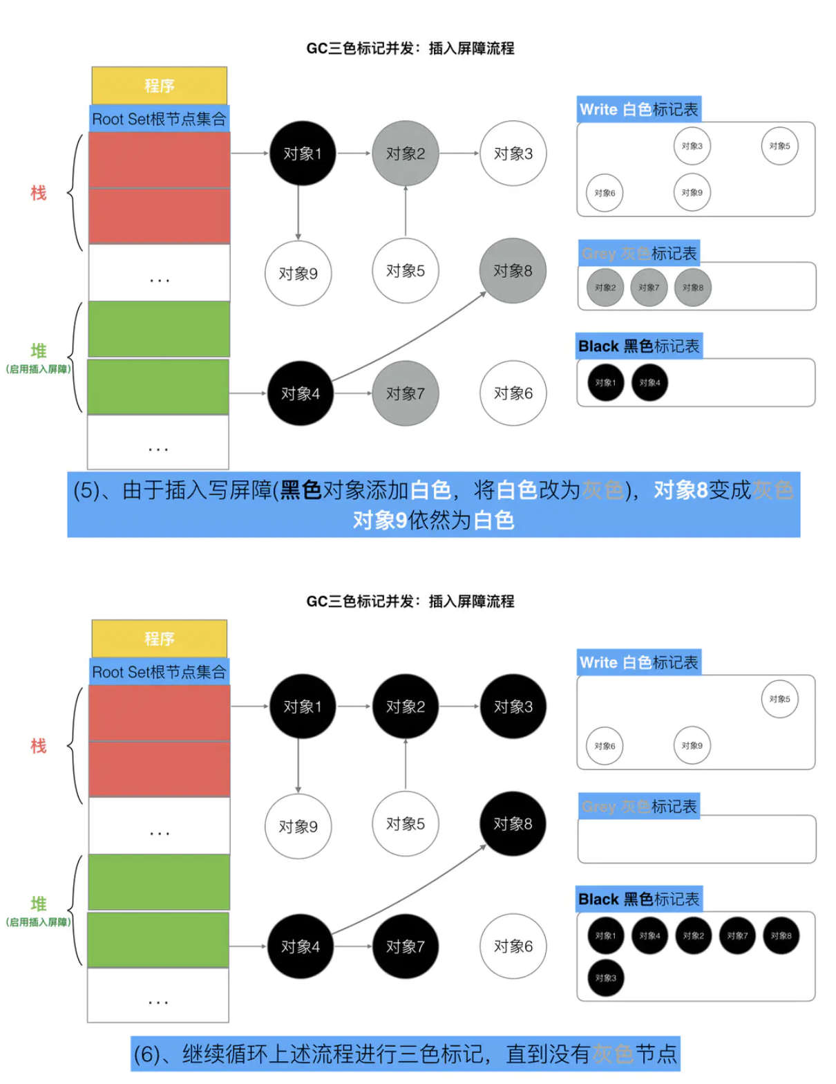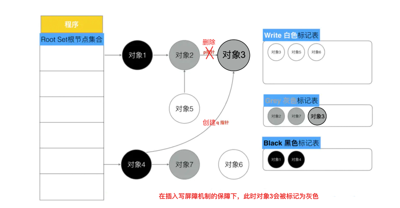 - 插入写屏障会在白色对象被黑色对象引用时触发,将白色对象被标记为灰色,这样就不存在黑色对象引用白色对象的情况了,从而实现强三色不变性(永远不会出现黑色对象指向白色对象),示例如下