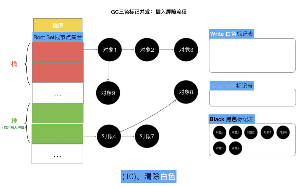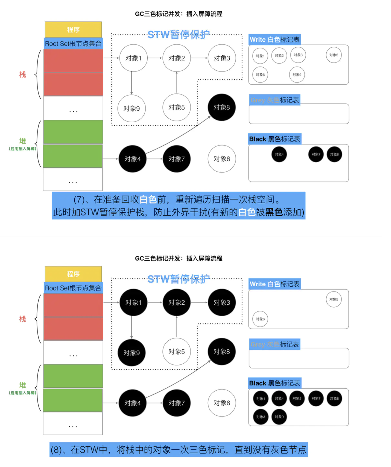 但是如果栈不添加,当全部三色标记扫描之后,栈上有可能依然存在白色对象被引用的情况(如上图的对象9). 所以要对栈重新进行三色标记扫描, 但这次为了对象不丢失, 要对本次标记扫描启动STW暂停. 直到栈空间的三色标记结束.