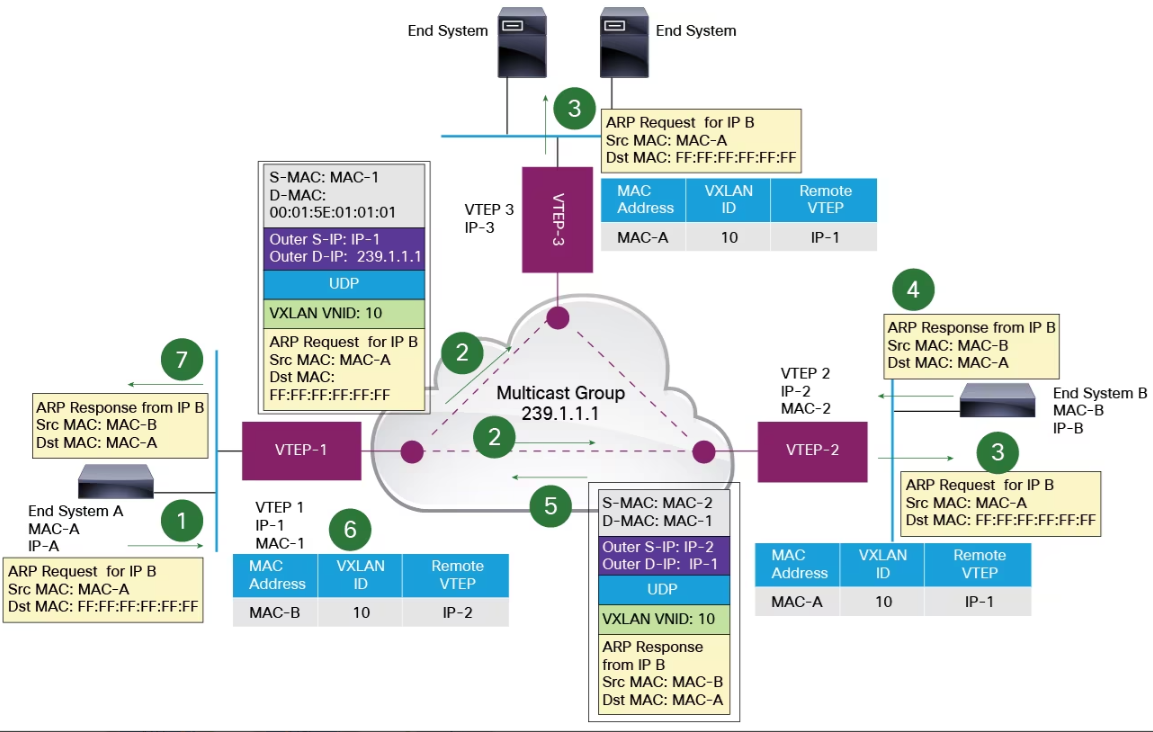 1、VTEP-1 收到二层 ARP 帧1(A 要查找 B 的 MAC) 后,发出一个 Dst IP 地址为VTEP多播组 239.1.1.1 的 VXLAN 封装 UDP 包。