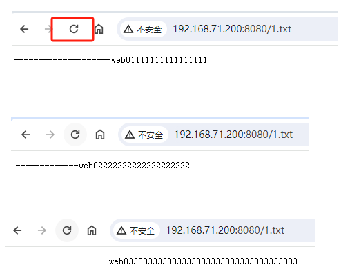 [root@db ~]# curl http://192.168.71.200:8080/1.txt ---------------------web033333333333333333333333333333333333 [root@db ~]# curl http://192.168.71.200:8080/1.txt -------------web02222222222222222222 [root@db ~]# curl http://192.168.71.200:8080/1.txt --------------------web01111111111111111