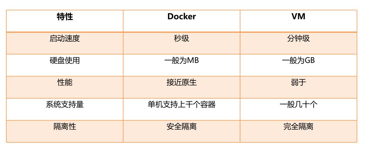 运行Docker容器不需要额外的虚拟化管理程序的支持,Docker是内核级的虚拟化,可以实现更高的性能,同时对资源的额外需求很低,与传统的虚拟机方式相比,Docker的性能要提高1~2个数量级。